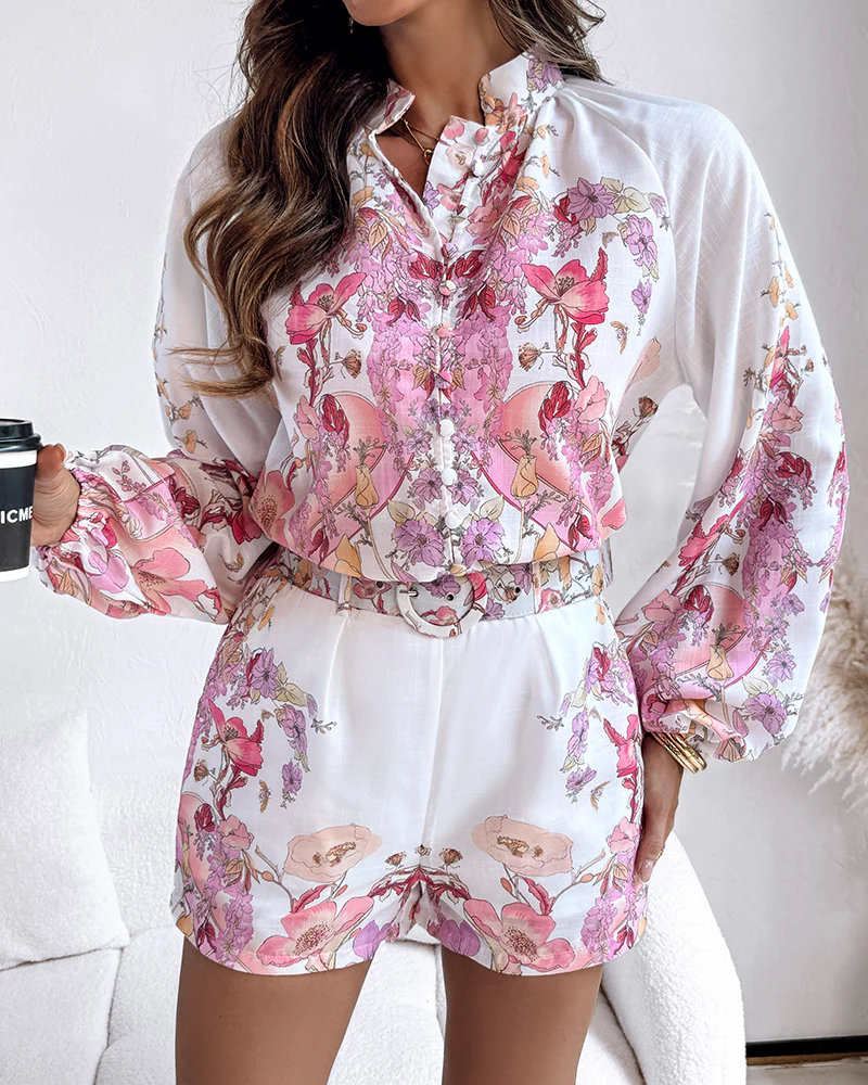 2 Pieces Outfit Floral Placement Print Stand Collar Button Button Front Lantern Sleeve Top and Casual Elastic Back Waist Shorts Set with Belt