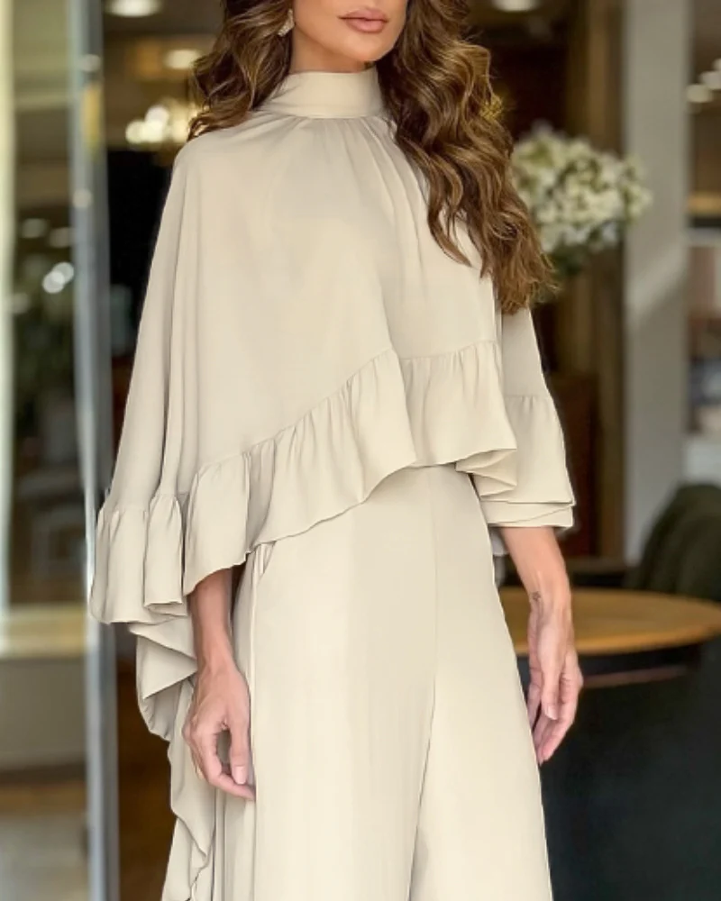 2 Pieces Outfit High Neck Hollow-out Back Ruffles High-Low Hem Cape and Casual Elastic Back Waist Wide Leg Pants Set