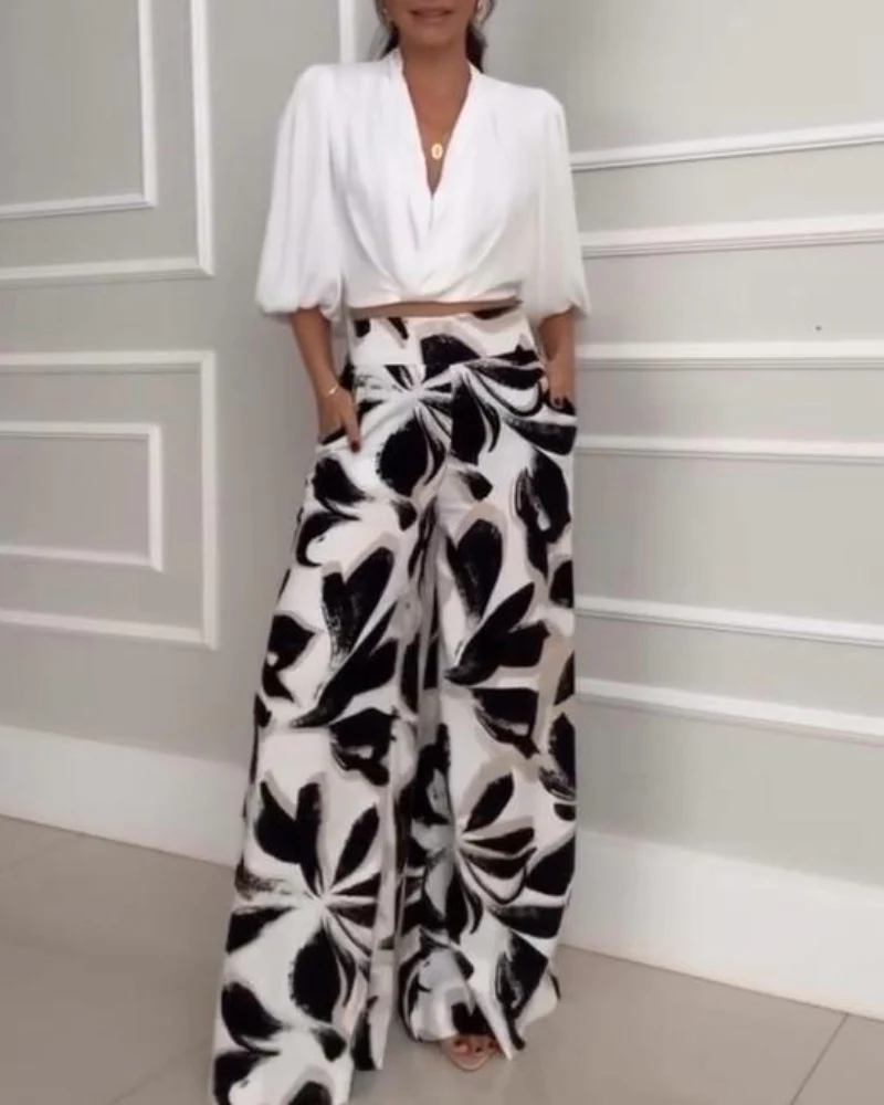Silhouette & Fit: The cropped blouse features a ruched overlap V-neck and three-quarter sleeves with elastic cuffs and hem for a flattering, adjustable fit. High-waist wide-leg pants with an elastic back waistband elongate the legs while maintaining comfort.