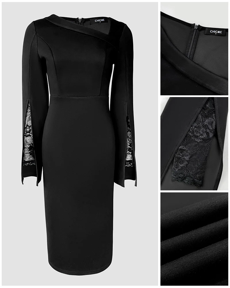 Asymmetrical Foldover Neck Lace Long Sleeve with Split Sleeve Overlay Party Dress Slim Fit Zipper Back Slit Commuting Dress