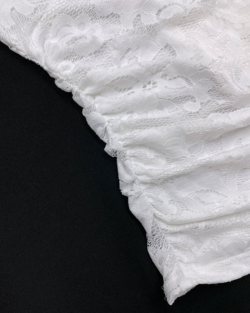 Contrast Lace Deep V-Neck Lantern Sleeve Lace Overlay Ruched Blouse Long Sleeve Slim Fit Top