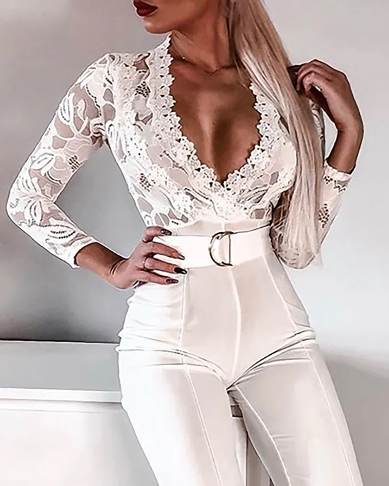Crochet Lace Trim Deep V-Neck Floral Lace Spliced Ovearalls Casual Zipper Back Seam Front Jumpsuit with Belt