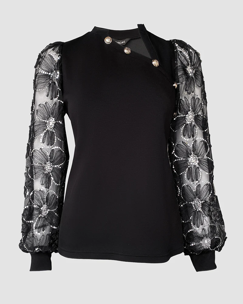 Button Decor Asymmetrical Neck Lantern Sleeve Tee Casual Sequin Decor Floral Pattern Sheer Mesh Long Sleeve Top