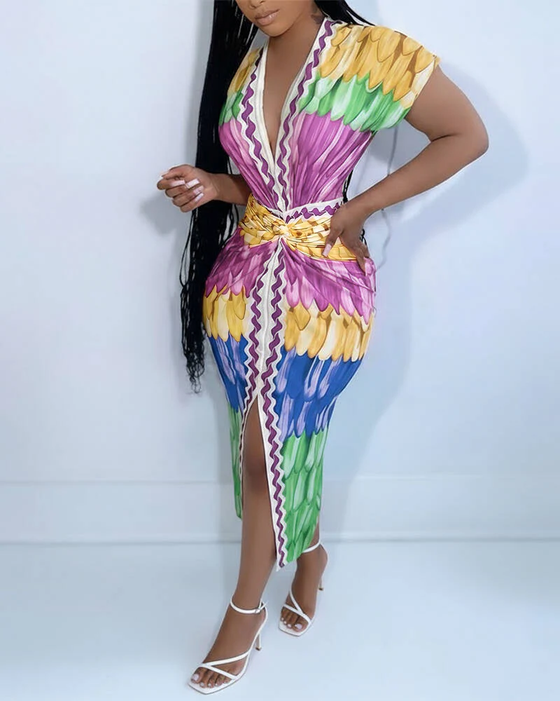 Multi-color Print Deep V-Neck Front Slit Dress Casual Twist Front Cinched Waist Vacation Dress