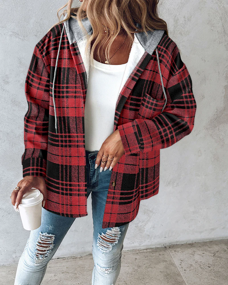Plaid Print Button Front Pocket Design Drawstring Hoodie Jacket Casual Asymmetrical Hem Thermal Lined Warm Coat