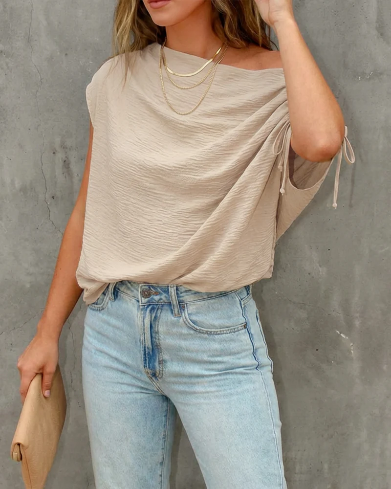 Skew Neck Drawstring Sleeve Loose Fit Casual Top